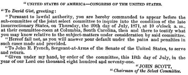 In December 1871, the committee confronted a novel parliamentary question when KKK members Clayton Camp and David Gist failed to appear when subpoenaed by one of the subcommittees, and when W. L. Saunders refused to testify so as not to incriminate himself. Earlier laws stated that witnesses could be held in contempt by “either” House, but no U.S. or English parliamentary precedent offered guidance on how to handle a contempt action involving two legislative bodies. Because the joint committee issued the key subpoenas, Congress had to rule on how this type of contempt should be handled. After debate, the Senate passed a Senate resolution issuing an arrest warrant for all three individuals for contempt of Congress. Asher C. Hinds, Clerk of the House of Representatives, later explained in a compilation of congressional precedent: