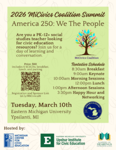 The 2026 MI Civics Summit will be on March 10th at Eastern Michigan University. Join us for a day of learning and conversation!